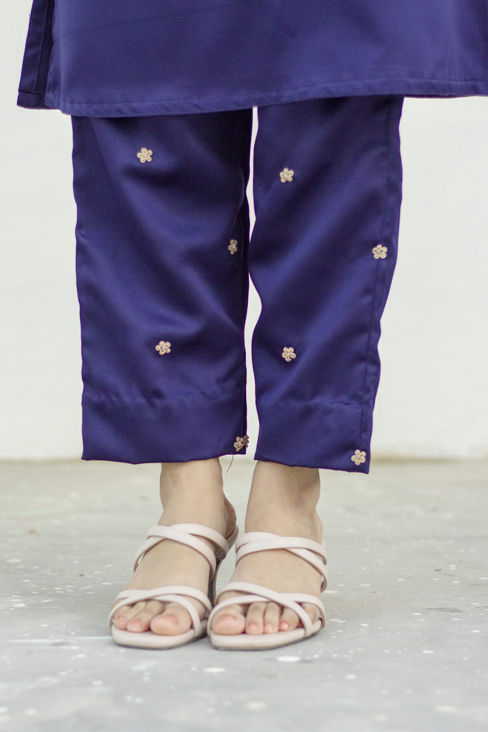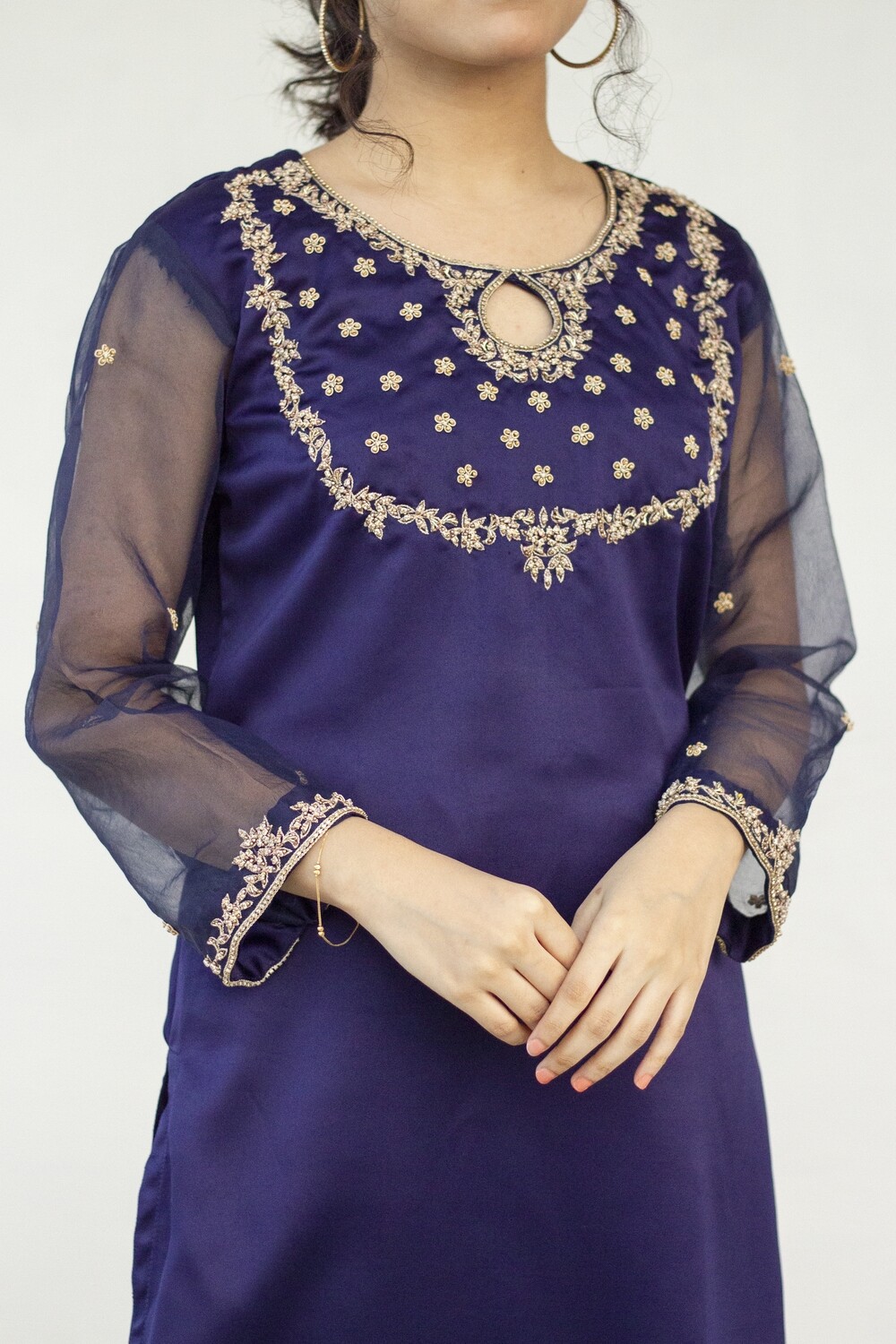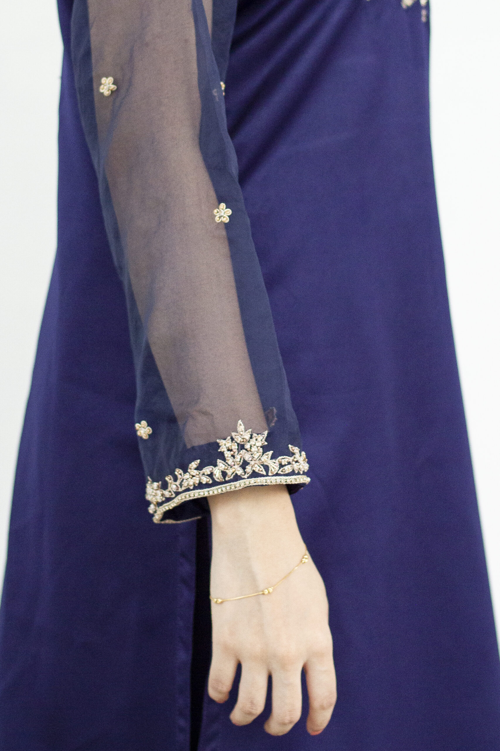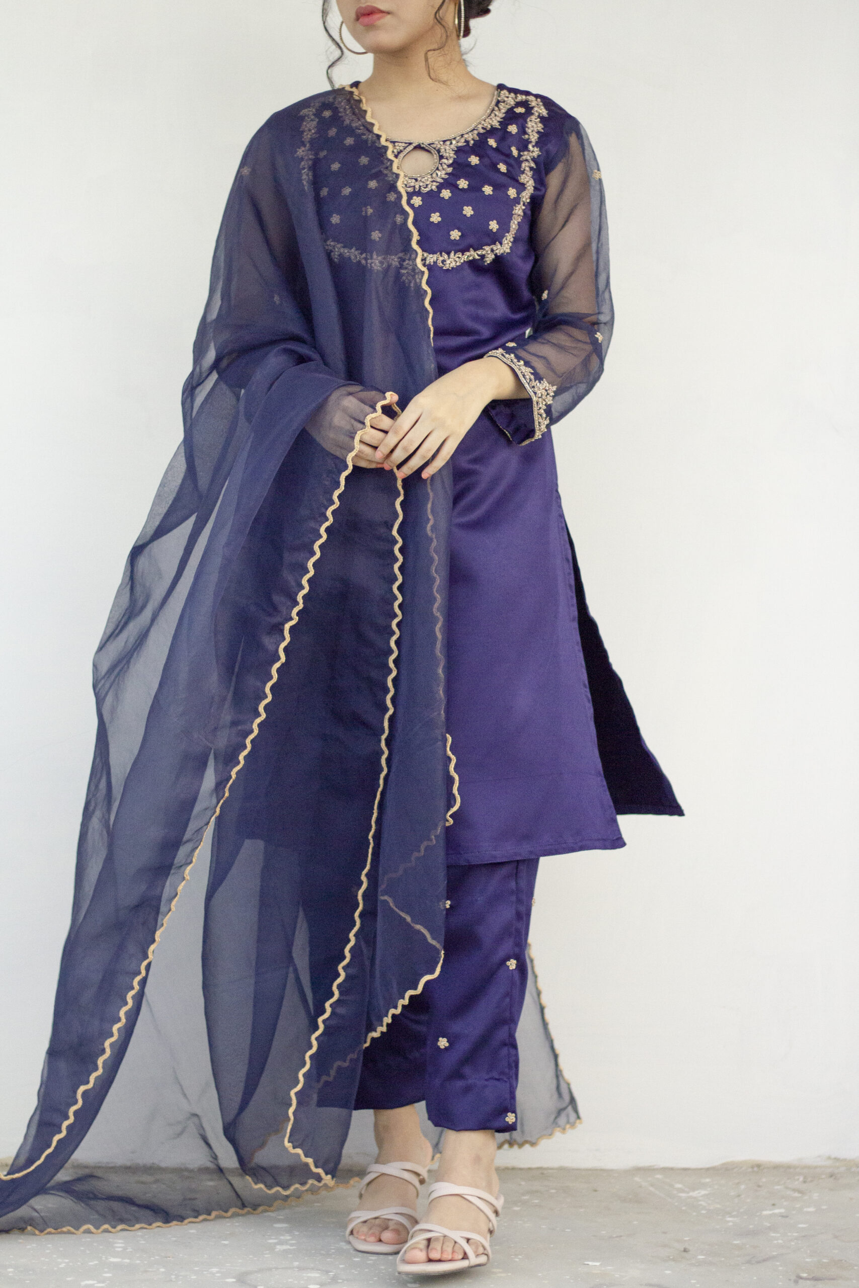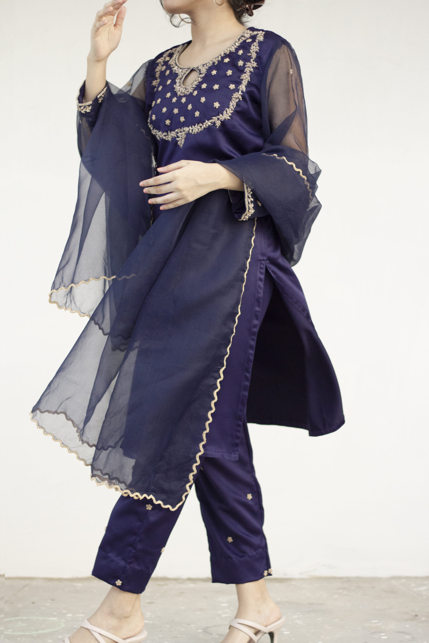 A midnight blue silk set. kameez’s neckline glimmers with detailed handwork of kora, dabka and nug. Trouser of anaya features gold embellishments at the bottom. This captivating set is completed with a midnight blue cut-work organza dupatta.