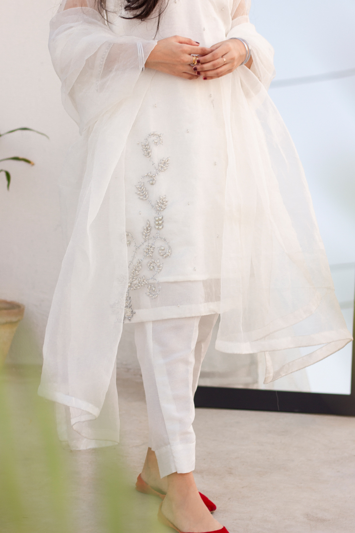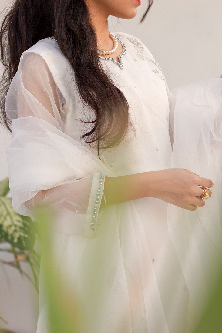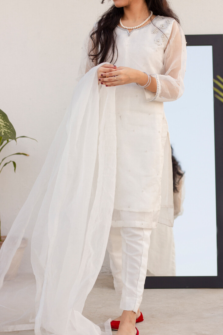 A feminine silhouette featuring a luxuriously handmade border and neckline using moti, tilla, and sequins. Dazzle your way through a sunlit affair or an evening soirèe in this organza and raw silk set that is artfully embellished to add the right sheen.