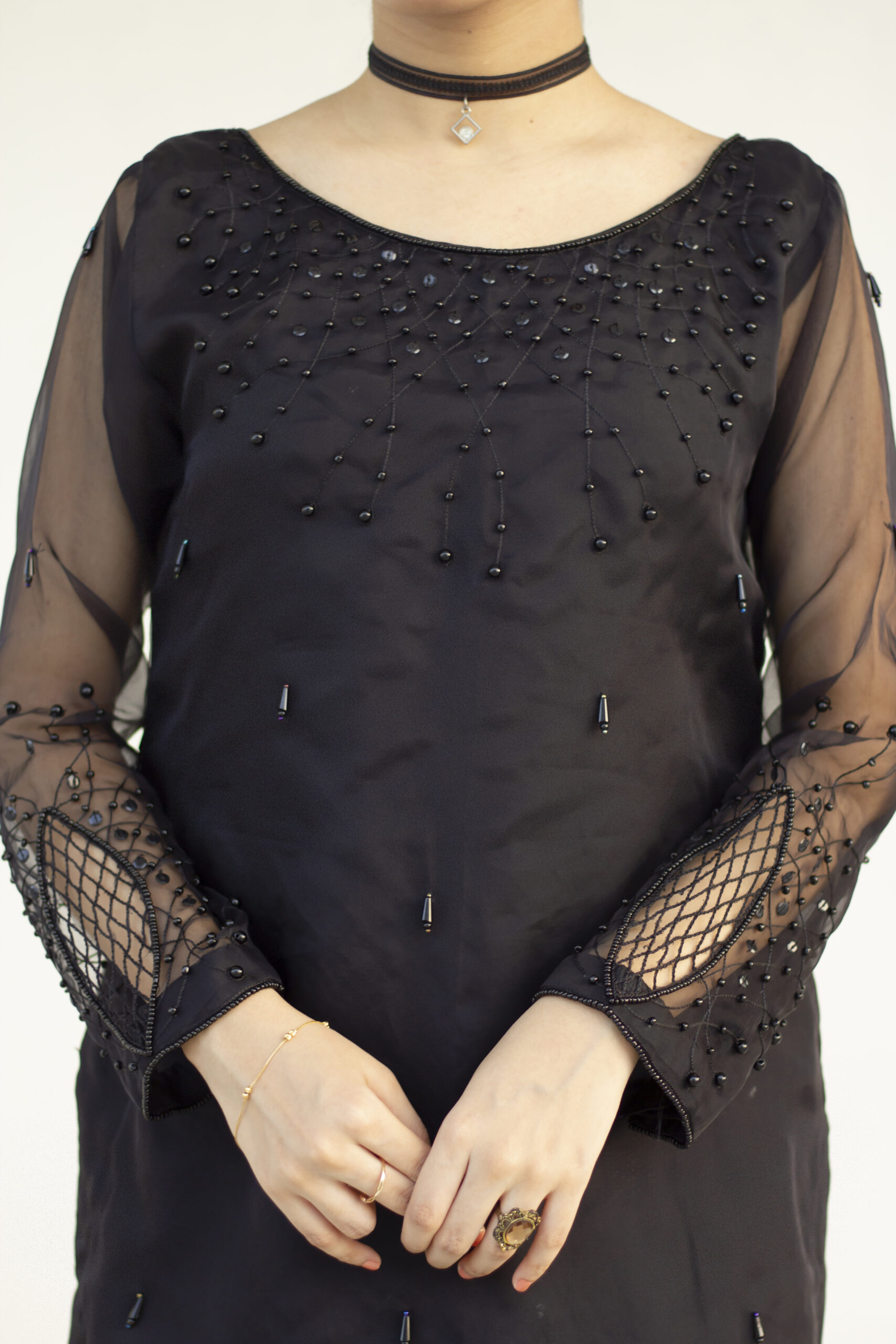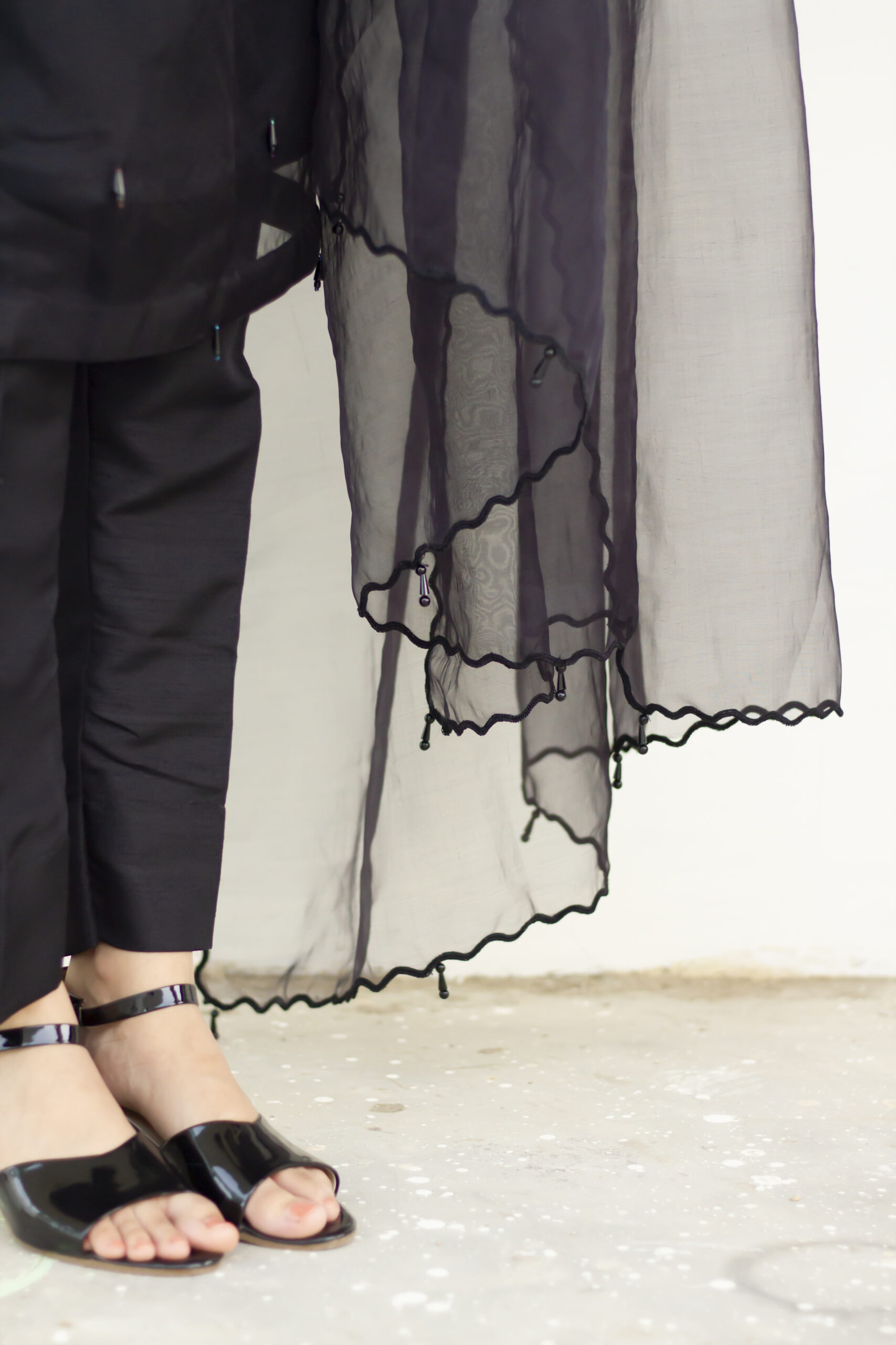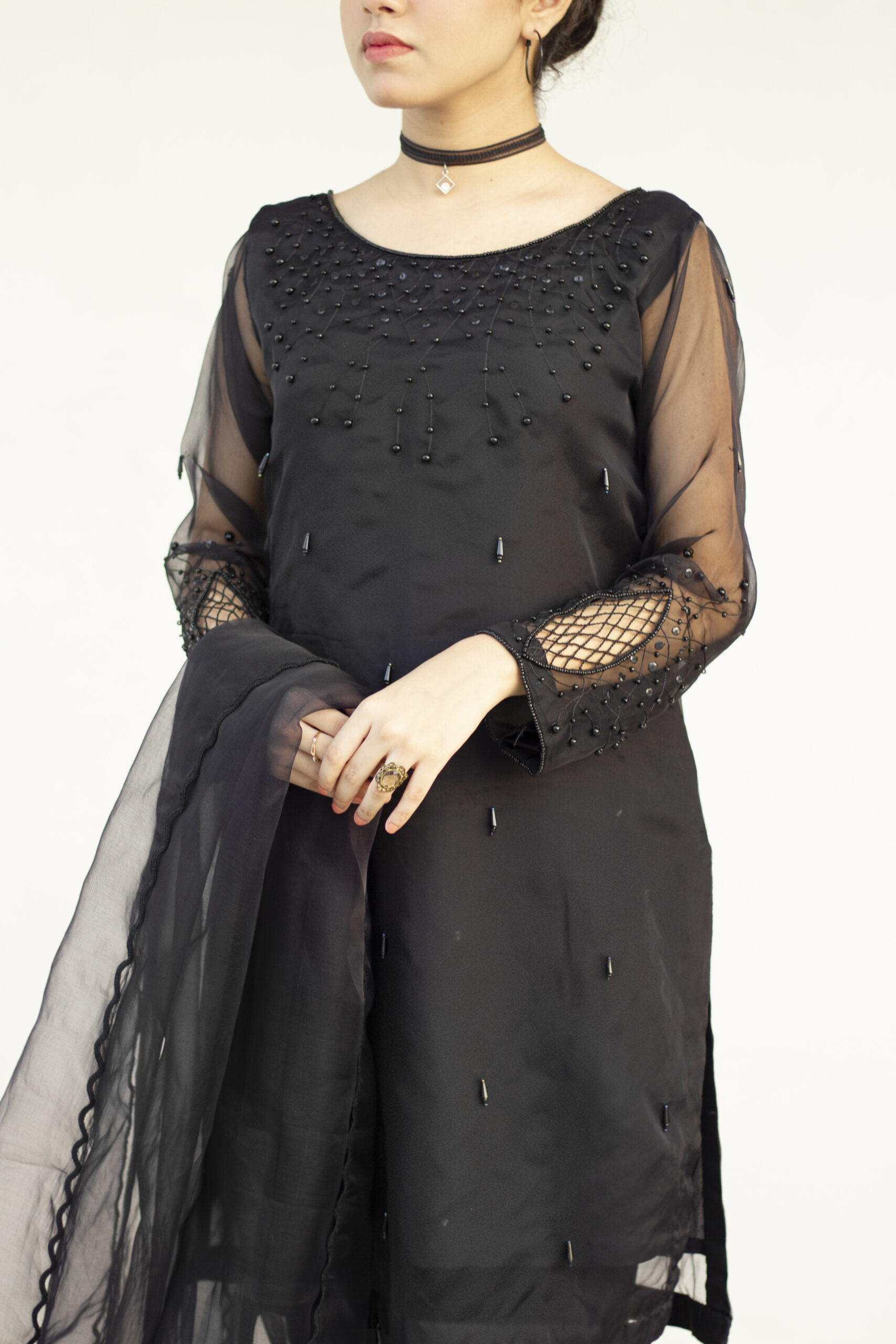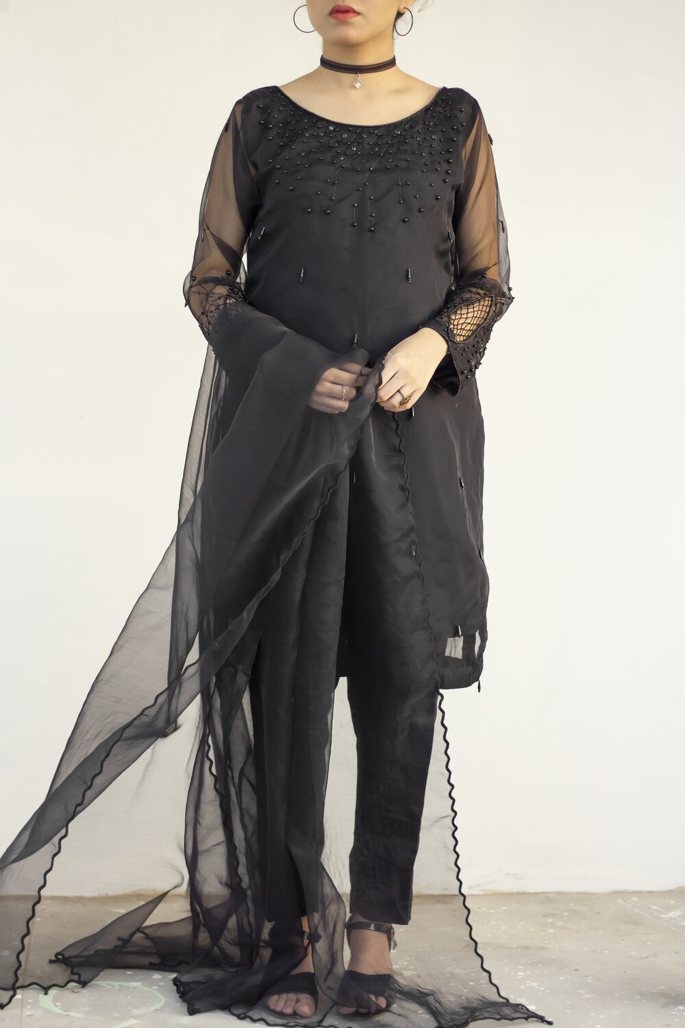 A classic black organza set. Zainab’s organza kameez is entirely covered with dangly black crystals. The neckline is fully embellished with handwork of black reshum, crystals and sequins. Along with black embroidery and net cut work on the sleeves. This quintessential monochromatic set comes with the perfect raw silk trouser and intricate cut work on the organza dupatta.